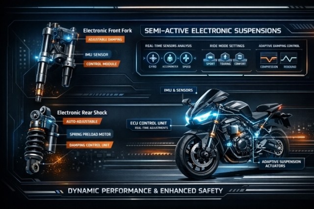 • Precarico automatico: I sistemi più evoluti rilevano il peso di passeggero e bagagli, regolando automaticamente l'altezza della molla posteriore per mantenere la corretta geometria della moto.