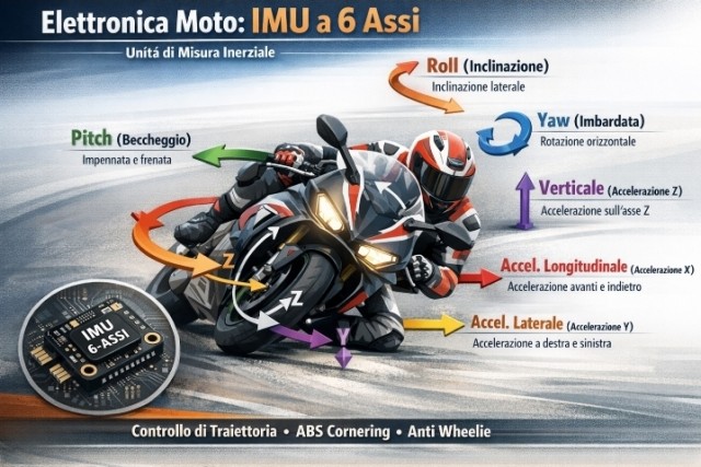 La sigla IMU sta per Inertial Measurement Unit. Per capire cosa faccia realmente, dobbiamo immaginare la moto immersa in un sistema di assi cartesiani. Una piattaforma a 6 assi misura i movimenti lungo e attorno a tre direzioni fondamentali. I primi tre "assi" riguardano le accelerazioni lineari: avanti/dietro (accelerazione e frenata), destra/sinistra (spostamenti laterali) e alto/basso (sobbalzi e avvallamenti). Gli altri tre, i più cruciali per la dinamica motociclistica, misurano le velocità angolari, ovvero le rotazioni.