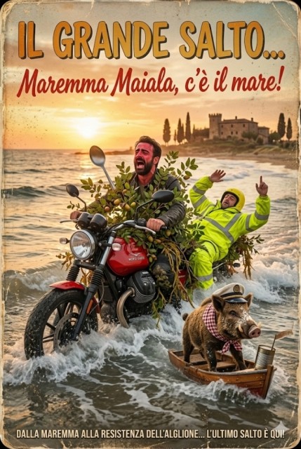 Ugo il Cinghiale, sbalzato dal manubrio, atterrò dritto sulla battigia. Un gabbiano, scambiandolo per una preda o forse per un vecchio nemico, provò a picchiare su di lui, ma si ritirò prontamente dopo aver annusato il persistente odore di aglione e stalla maremmana che emanava dal peluche. Ugo era salvo, ma la sua espressione di pezza sembrava dire: "Riportatemi a Siena".