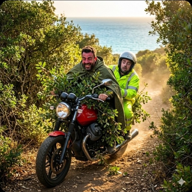 "Vedi Saetta? La mia moto è viva! È un ecosistema semovente!" urlava Sfreccia mentre una piccola ghianda oscillava pericolosamente vicino al pedale del freno. La V7 ormai non sembrava più una moto, ma un cespuglio motorizzato che emetteva rombi sordi e perdeva foglie a ogni scalata.
