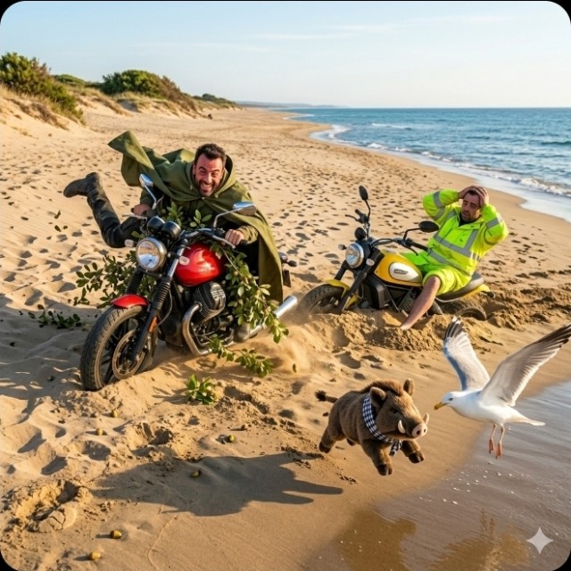 Il risultato fu una scena da film muto: le ruote stradali della Guzzi affondarono istantaneamente nella sabbia morbida, catapultando Sfreccia e il suo ramo di leccio in avanti. Saetta, nel tentativo di imitarlo, finì in una duna laterale, con la Ducati gialla che sembrava un enorme limone spiaggiato.