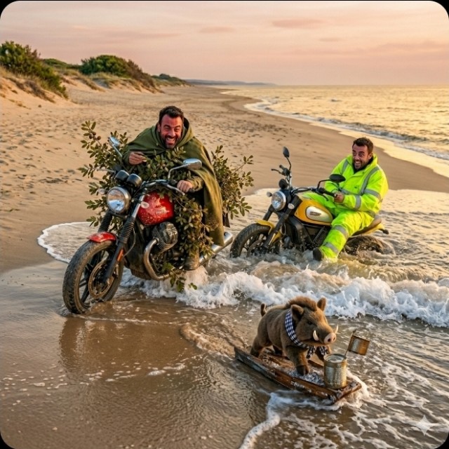 L’ultima volta che abbiamo avvistato Sfreccia-Senza-Meta e Saetta Lumaca, la situazione era, per usare un eufemismo, letale. La Guzzi V7 di Sfreccia era tenuta insieme dal nastro americano e da un ramo di leccio usato come pedana d'emergenza, mentre Saetta era diventato un tutt'uno con la sua tuta antipioggia, muovendosi con la grazia di un palombaro fuori dall'acqua. Ma dopo il fango del pascolo e i morsi del vitello a Ugo il Cinghiale, una nuova fragranza ha iniziato a farsi strada nei caschi: quella del salmastro.