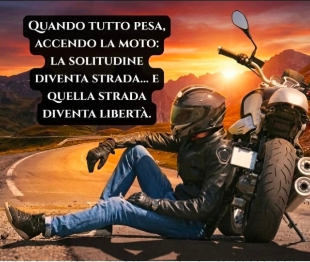 "L'asfalto che corre sotto le ruote è un foglio bianco su cui riscrivere la mia storia. Ad ogni curva, il passato svanisce e il futuro si apre davanti a me, libero e inesplorato. La velocità mi avvolge, mi culla, e in quel momento sono solo io, la mia moto e l'infinito. Nessun vincolo, nessuna responsabilità, solo la purezza dell'istante presente. Sento il vento che mi accarezza il viso, l'odore della libertà nell'aria, e so che qui, in sella alla mia moto, sono veramente vivo."