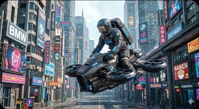 Kael strinse le manopole del suo modulo a levitazione. Non era un veicolo comune: era un prototipo della BMW Orbital, un drone pesante a quattro turbine progettato per il trasporto rapido tra i livelli della città. Sulla sua tuta pressurizzata, il logo blu della compagnia brillava sotto i neon, riflettendo le insegne della "Techno-City" che affollavano i grattacieli.