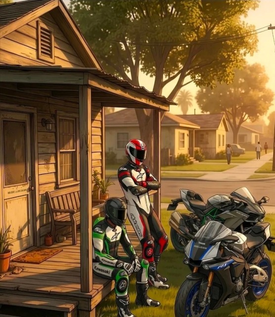 "La polvere dorata del tramonto si adagia sulle loro tute da corsa, come se il deserto volesse lasciargli un ultimo saluto. Hanno cavalcato l'alba e sfidato il vento, e ora, sotto il portico di questa casetta di legno che sembra sussurrare storie di un tempo passato, ritrovano la pace. I loro cavalli d'acciaio riposano sull'erba, silenziosi custodi di mille avventure, mentre nell'aria vibra ancora l'eco di un rombo che non si spegnerà mai. In un mondo che corre veloce, in un'epoca di asfalto e di fretta, questi due cavalieri del futuro si fermano, per un istante, a respirare l'eternità."