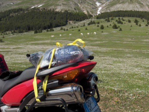 Il materiale contenuto nel bauletto era quello che vedete legato alla sella + mezza bottiglia d'acqua da 1 litro e mezzo; cioè, il peso totale trasportato era inferiore ai 4 kg e la velocità percorsa in quella giornata piuttosto bassa, dato che mi trovavo in zone di montagna. Il bauletto l'ho dovuto lasciare sul posto, essendosi fracassato e non sapendo più come trasportarlo fino a casa.