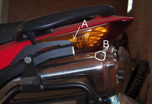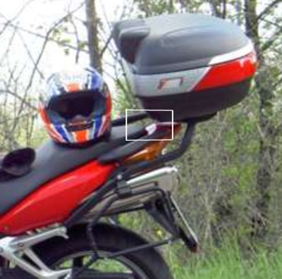 Se però siete già sfortunati possessori di staffe siffatte, cercate in tutti i modi di predisporre un punto di fissaggio della piastra alla parte terminale del codone della moto (esempio: alle maniglie per il passeggero), più o meno nella zona dove ho disegnato il rettangolo; in questo modo si diminuisce il carico sulle staffe e la loro oscillazione.