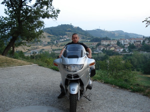 Sabato 15 luglio partenza di buon ora, alle 6, anzi alle 6,10 in quanto Barbara ci ha messo un pò di tempo a capire che per fare la foto bisognava schiacciare il pulsante della macchina. Certo che anche il sottoscritto era bello addormentato, guardate un pò che "cera" che ho nella foto, poi mi sono anche dimenticato abbassato il cavalletto... sullo sfondo il Castello di Sarzano, quello, per chi non lo sapesse, del logo del Tingavert.