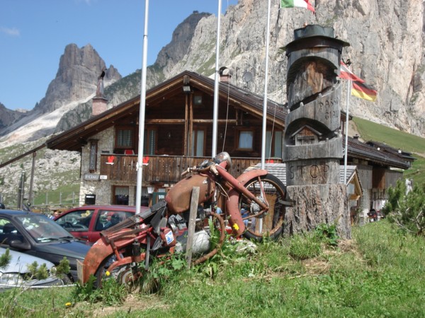 Qui al passo i motociclisti arrivano spesso affamati ed assetati, guardate un pò questo nostro amico come ha parcheggiato la sua Zundapp per correre al rifugio...