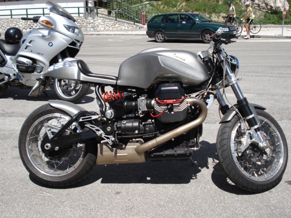 Anche sul Passo Falzarego parecchi bikers, bellissima questa Moto Guzzi sapientemente preparata.