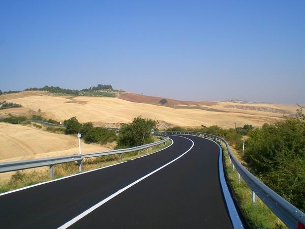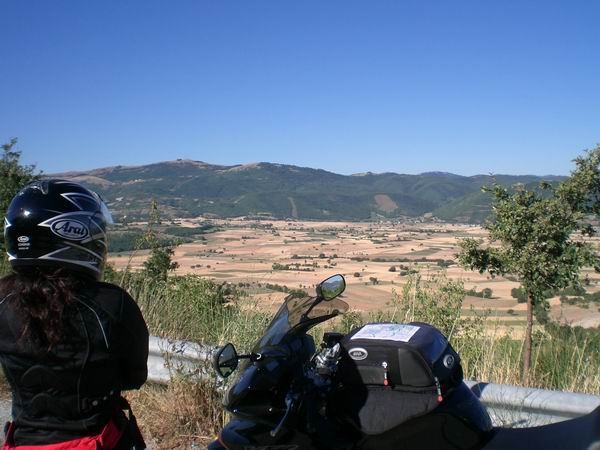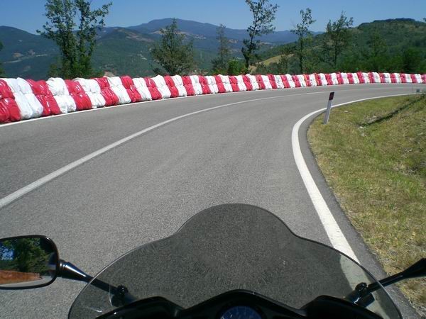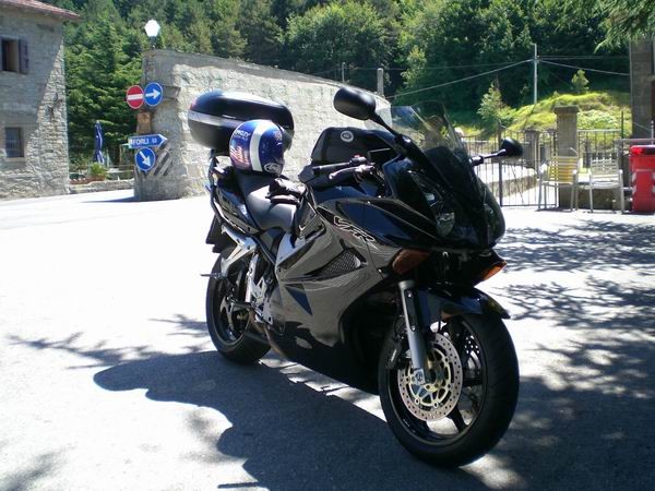 Primo giorno. Partenza da Reggio Emilia verso la 8.30. Il VFR equipaggiato con treno di gomme nuove Pirelli diablo strada ( che si riveleranno fantastiche ) bauletto, borsa serbatoio e porta telepass il tutto GIVI. Un plauso alla moglie che è riuscita ad organizzarsi con un bagaglio " minimal Chic" . Autostrada sino a Forlì e poi su per le SS 67 del Muraglione. Un pò rovinata la parte romagola, molto bella la parte toscana.