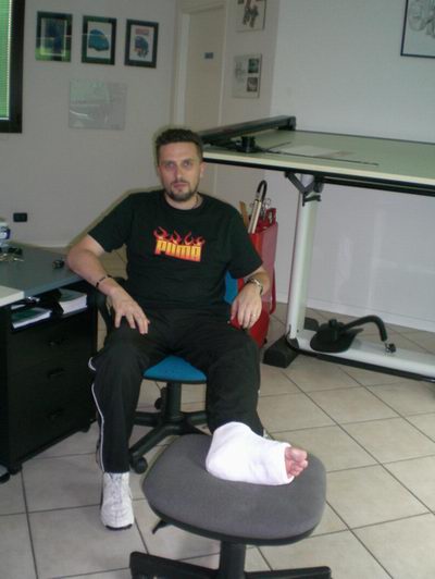 Visto che ormai avevo finito le varie menate dell'ultimo periodo ( fiere, lavoro, impegni vari ) e già mi pregustavo ad terminare nel meglio dei modi l'annata con un pò di svaghi ( nozze Nigo, chiusura stagione moto con la classica fungata, salone di Milano, SuperBowl a Genova...) ed invece ho pensato bene, Venerdì sera di fracassarmi un piede giù per le scale di casa. Da vero pirla. Morale : Frattura composta al V tarso del piede sinistro, un bel gesso sino al ginocchio per 25 gg. con probabile proroga con qualcosa di più leggero ed una bella rieducazione. Ciò vuol dire a parte gli ovvi casini sul lavoro ( ...sai noi autonomi...) anche chiusura anticipata della stagione 2006. A rischio anche ( sgrat - sgrat ) l'uscita a sciare in Dicembre. Ma lì sono più possibilista.