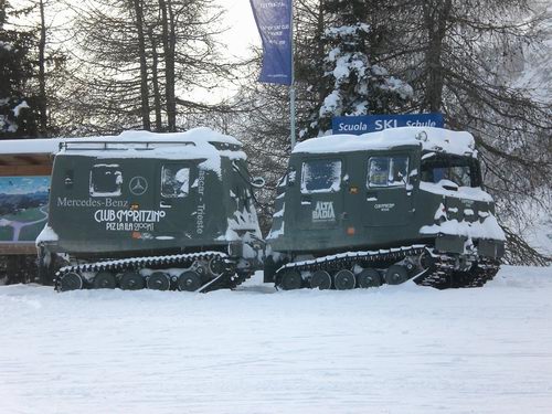 Guardate questo strano mezzo cingolato. Serve per portare in quota su Piz la Ila chi volesse passare la serata al club Moritzino, uno dei rifugi più "Cool" della Val Badia