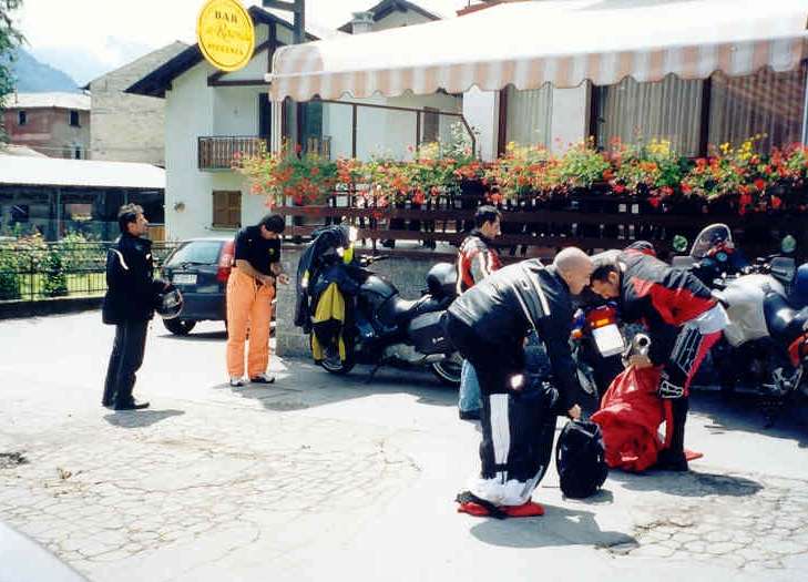 Una cosa che nelle gite del moto club non manca mai è la pioggia. Eccoci alle prese con le tute anti-acqua a Tirano provenienti da Livigno.... Che dù maron !