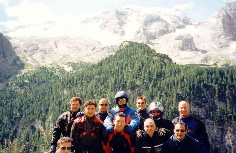 Una bella foto di gruppo con sfondo Marmolada.Da destra : Ilo, Varano, Berta, Vano,Oscar,Giango,Fox sr,Paolo, Fox jr, Ragno, Iames ( 07.11.2001 )