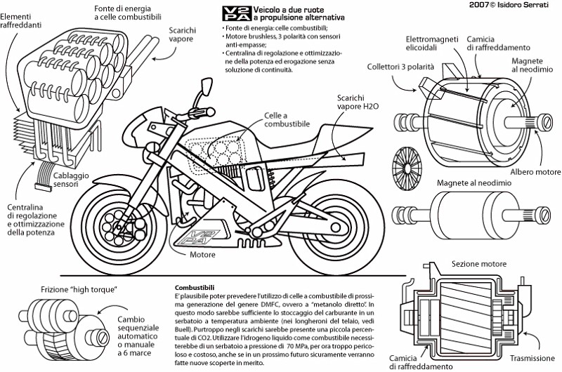 Vorrei aggiungere alle tue note alcune osservazioni sulla tecnologia dei veicoli elettrici. Vorrei innanzitutto premettere che le DMFC, o celle a metanolo, non sono proprio le più promettenti, per alcuni problemi legati sia alla quantità di catalizzatore necessario alla reazione del metanolo -e quindi costo esorbitante e destinato solo a crescere nel futuro - sia alla bassa efficienza delle stesse celle. L'idrogeno, invece, è un combustibile ancora lontano, perchè non è prodotto da elettrolisi dell'acqua - l'unica maniera effettivamente ecologia - ma industrialmente dal metano o altri idorcarburi - tutt'altro che ecologici. Riguardo invece alla sicurezza dell'idrogeno, è sempre stato molto più sicuro di qualsiasi altro combustibile, benzina e diesel compresi. La sicurezza è piuttosto legata al suo accumulo, che a bassa pressione richiede sistemi pesanti, complicati ed ingombranti (al momento dimenticatevi i "nanotubi", una bufala americana - almeno fino a prova contraria, come sempre). Ad alta pressione richiede invece sistemi affidabili, perchè una bombola da 700 bar non è proprio un giocattolo. Se in passato non ce ne erano, ma solo perchè non sarebbero servite a nessuno, adesso ci sono, sono resistenti, tanto da essere la parte più rigida di un autoveicolo, leggere e ovviamente costose, perchè non hanno un mercato di massa. Richiedono ancora ulteriori studi e test per comprovarne l'affidabilità nel tempo. Per quanto riguarda, invece, la propulsione elettrica, i vantaggi sono molto più immediati. Sono allo studio - e anche in uno stadio molto avanzato - batterie molto più performanti delle classiche: saranno più leggere, adattabili agli spazi disponbili, e rapide da ricaricare. Il che significa che, considerato che i motori elettrici sono una tecnologia già più che matura, e che con l'elettronica non esiste ormai cosa che non si possa fare, la moto elettrica a batterie non è poi così lontana come quella a celle a combustibile. E se a qualcuno la cosa gli suonasse un po' di giocattolo per bambini... beh, provate l'unica realizzazione degna di nota: il maxi-scooter americano della Vectrix. L'ho provato e per quanto non abbia mai considerato gli scooter delle vere moto (non me ne vogliano gli scooteristi, a 40 anni è certamente un mio limite mentale), questo qui mi ha veramente impressionato positivamente. Tanto che, semmai dovessi - per qualche imponderabile motivo - decidere di comprare uno scooter, non ho dubbi.