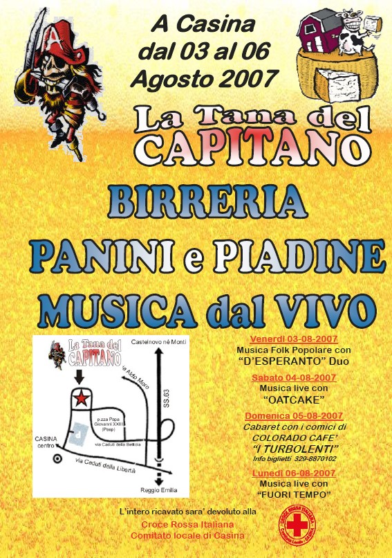 - Tutte le sere ci sarà musica dal vivo, con svariati gruppi dalla musica folk popolare alle cover italiane e straniere per le serate di sabato e lunedì sera, mentre la domenica nessun spettacolo per lasciare spazio ai giovani della pro loco e ai comici di Colorado, comunque la birreria funzionerà ininterrottamente... da venerdì 3 pomeriggio a lunedì 6 notte... troverete birra a fiumi (chiara, rossa weiss...) e tutti i cocktail immaginabili... ma soprattutto la nostra cucina con la piada di "Aurelio e Gilberto" imbottita di salsiccia spaziale!!!