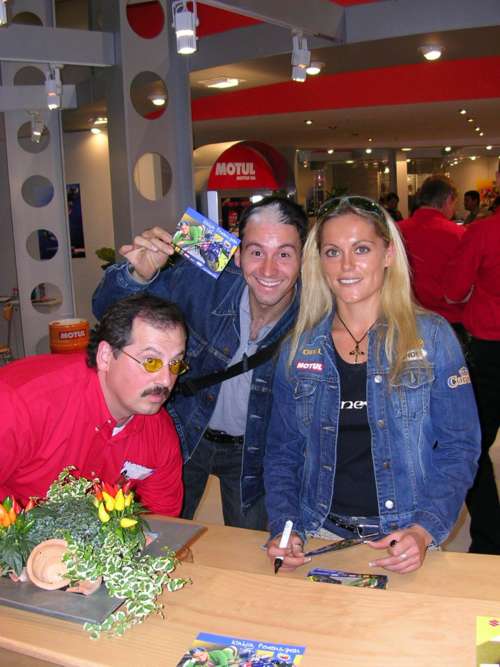 La biondina è Katia Poensgen, pilota della 250, quello con i baffi il suo team manager, quello col ciuffo bianco non lo conosco... , so solo che era in macchina con noi...