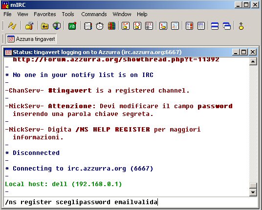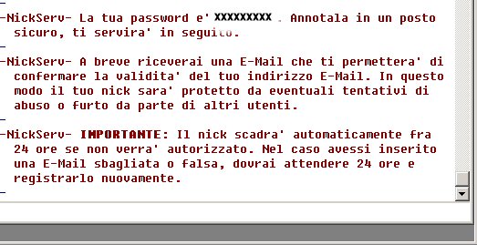 Adesso quando vi collegate a mirc sullo status e non in canale mi raccomando altrimenti tutti possono leggervi la password :) digitate