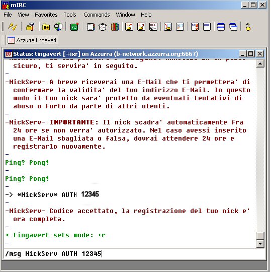 adesso sullo status di mirc incollate semplicemente /msg NickServ AUTH 12345