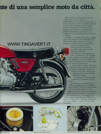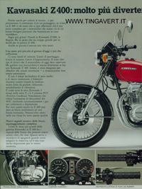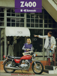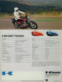 Depliant pubblicitario della Kawasaki modello Z400 con foto e scheda tecnica