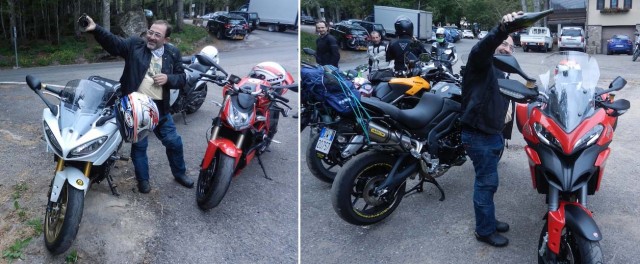 ), e poi ci ha ricordato che ogni giorno un motociclista si stampa su una curva, che la morte e la sventura sono sempre su di noi, e che bisigna andare piano... Sgrat sgrat da parte di tutti, ma non è bastato evidentemente, perchè sull'Amiata Lucio è andato leggermente lungo ed è finito sullo "sporco" ai lati, rischiando di finire addosso ad un albero o in un dirupo. Fortunatamente (si fa per dire) si è fermato in tempo, ma la moto si è appoggiata a terra rompendo una freccia e graffiando la borsa di sx.