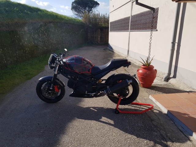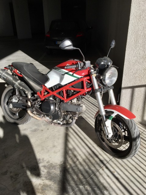 Ora mia moglie sta imparando il suo montriciattolo, la "multipla", docile e accondiscendente ha trovato il suo nuovo proprietario, ed io finalmente libero dalla necessità della moto comoda in due, mi son portato a casa una BELLISSIMA MONSTER S2R 1000 con 26000 km, messa bene a tagliandi, cinghie e pasticche freni nuovi, gommata al 80%, anno 2006.