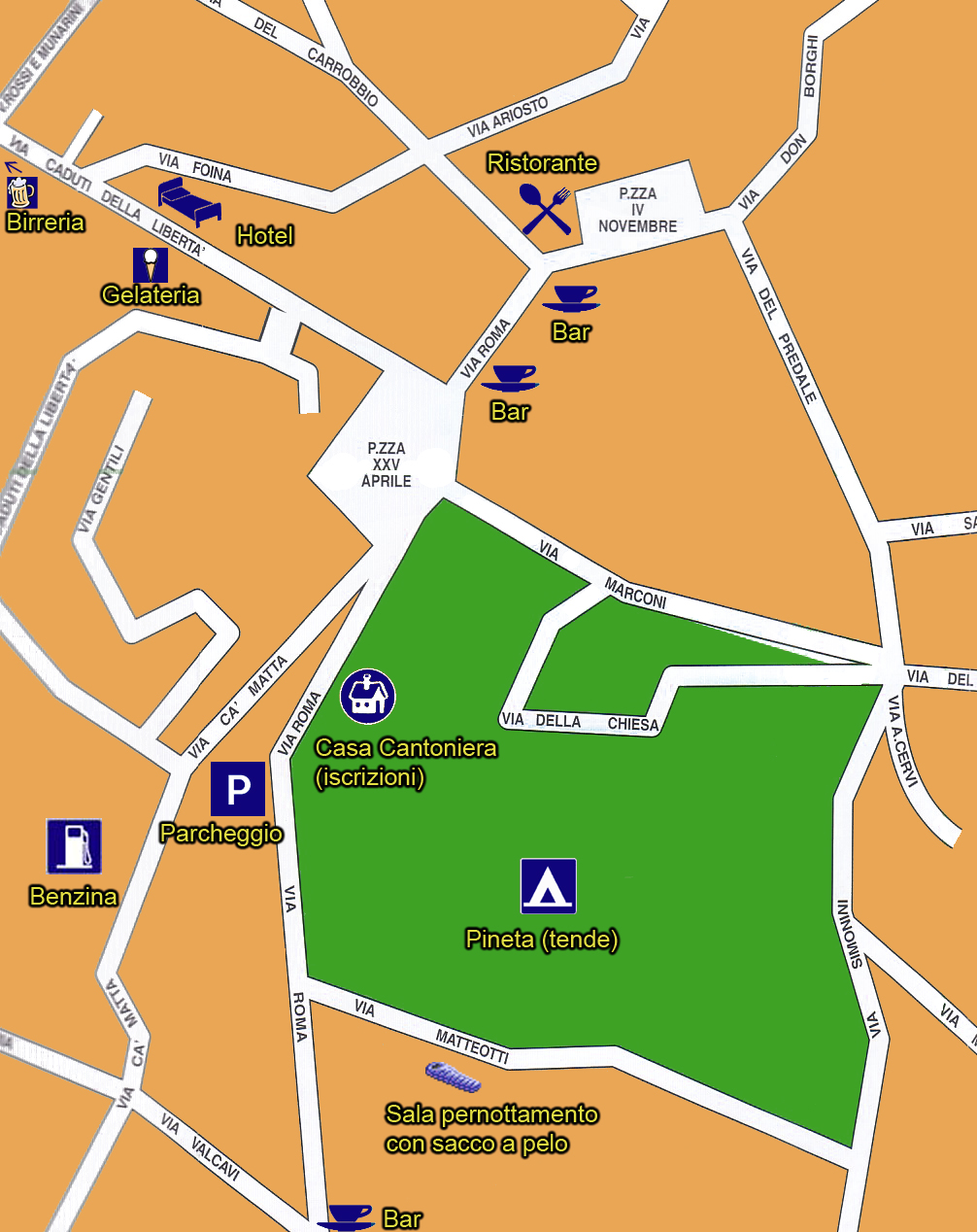 - Possibilità di piantare gratuitamente la propria tenda presso la locale Pineta, con servizi igienici abbastanza vicini (non essendo un camping, ci si deve però accontentare...)