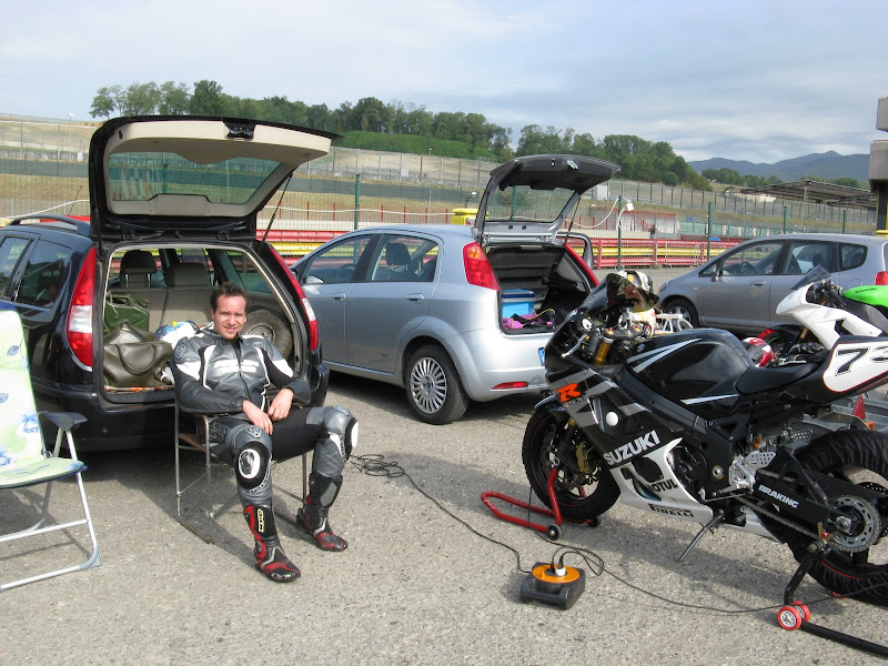 Finalmente arrivati all'autodromo, entriamo e prendiamo posto nel paddok, di li a 10 min arrivano altri due miei amici con il furgone, sistemiamo le moto sui cavalletti montiamo le termocoperte e via a sbrigare la burocrazia di rito e prendere il primo contatto guardando la pista dal tetto dei Box.
