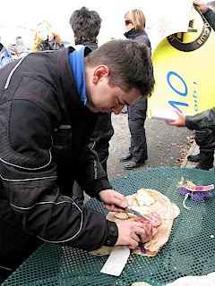 Dato che, si sa, l'aria frizzante di montagna ed il caldo sole stimolano l'appetito, ci diamo da fare con la finocchiona strategicamente consegnatami da Fabrizio50 la sera prima. Monsters dà prova della sua abilità da cerusico