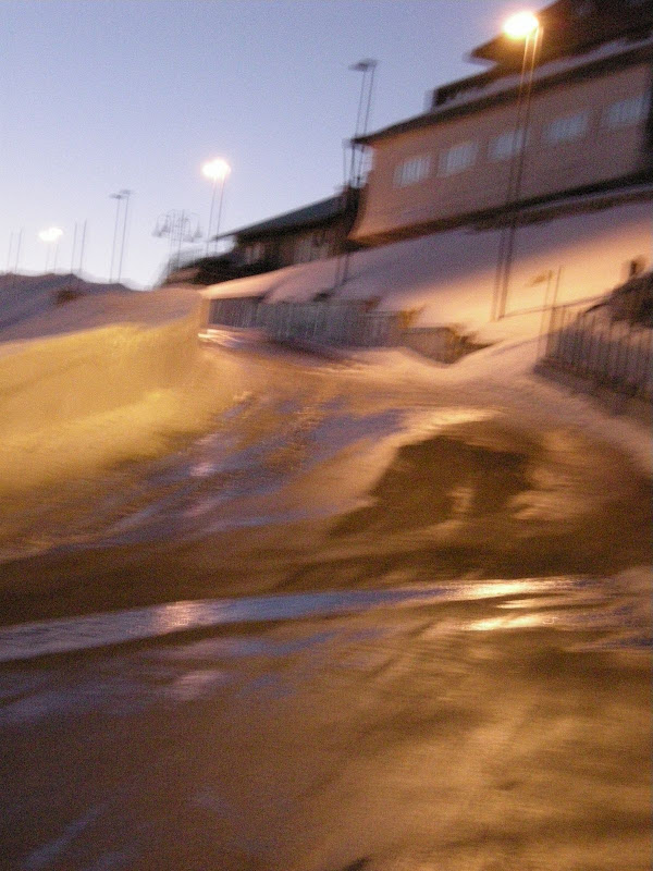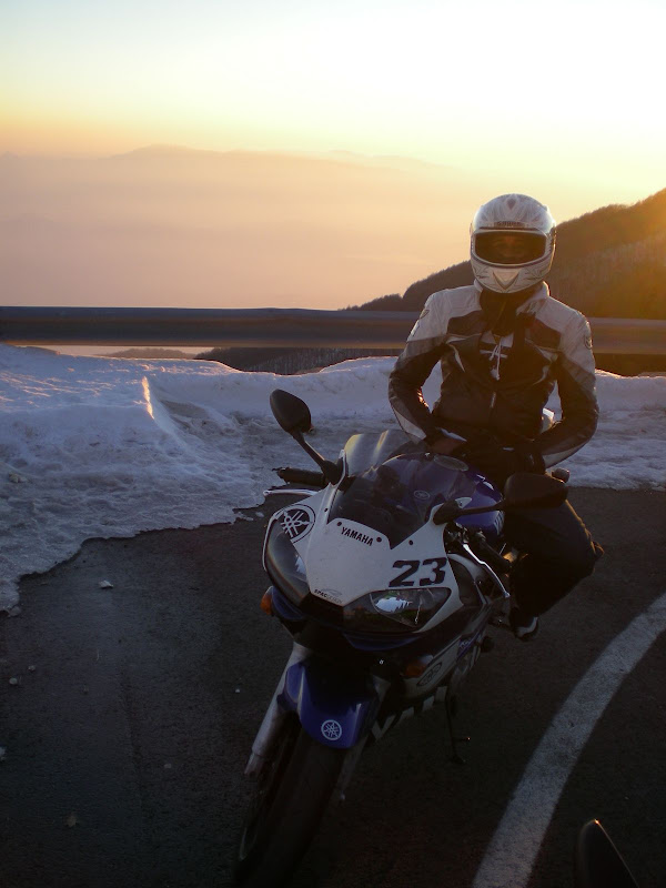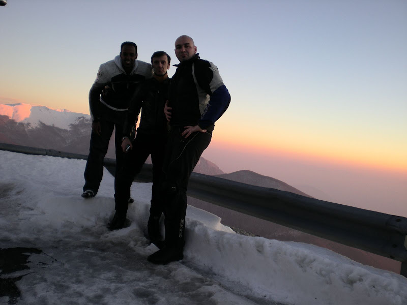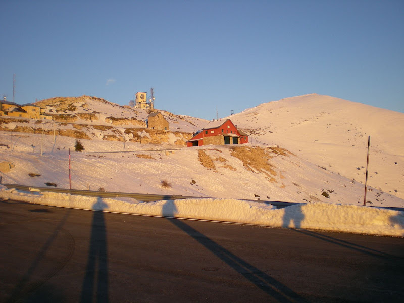 Il sole è molto basso all'orizzonte, sono quasi le 16 e 30 ed i colori sono stupendi, veniamo gratificati da una "enrosadira" (termine in lingua Ladina usato nel SudTirolo per indicare il colore rosato che assumono le montagne al tramonto); facciamo un po' di foto, cazzeggiamo qualche minuto e conveniamo che non è il caso di trattenerci a lungo se vogliamo evitare brutte sorprese scendendo. Abbiamo bisogno di bere qualcosa di caldo ed optiamo per andarcelo a prendere ad un bar poco più sù, vicino alle piste, e qui commettiamo la più grossa leggerezza della giornata; già, perchè saliamo una stradina verso una grossa costruzione dove c'è il bar senza renderci troppo conto che dell'acqua che scorre in diagonale da una parte all'altra, l'ha quasi completamente ghiacciata. Riusciamo a salire tranquillamente ma quando arriviamo su e scopriamo che il bar è chiuso, dobbiamo voltare le moto per tornare indietro e scendiamo a passo d'uomo perchè ci siamo resi conto che la situazione è delicata. Gig in testa (io dietro e da ultimo Twenty), scende piano piano con entrambi i piedi a terra e ogni tanto tocca il freno davanti, io preferisco andare solo col sinistro a terra e l'altro appoggiato sul freno posteriore; dopo pochi metri, proprio mentre penso che non dovrebbe scendere così (ma non so come dirglielo) vedo la moto inclinarsi a sinistra "no, no, no, no, no, no, no, no, no" (questo l'unico pensiero che attraversa il mio cervello) e trak! gig è a terra con tutta la moto; mi fermo con calma e spengo il motore, Twenty si ferma dietro a me. Scendiamo verso Gig, non senza difficoltà, visto che a piedi si scivola incredibilmente di più e rischiamo cento volte il ruzzolone (e di romperci qualche osso). Il problema è che adesso è difficilissimo tirare su la moto, perchè scivola da tutte le parti, l'unico modo è riuscire a farla appuntare verso centro strada dove c'è uno strato di neve ghiacciata che forma un bello scalino. Piano piano, tra sbuffi e imprecazioni, riusciamo nell'intento.
