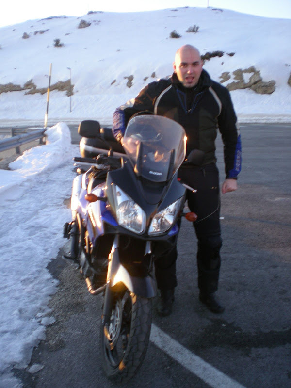 Proseguiamo, l'aria è veramente pungente, ma non sento freddo (segno che l'abbigliamento sta funzionando a dovere), finiamo credo a Fiuggi e, a ben guardare, la montagna s'è allontanata invece di avvicinarsi. Gig chiede informazioni ad un gentile signore il quale ci indica le due alternative per raggiungere la nostra meta e noi che facciamo? Invece di proseguire scendendo verso Trivigliano e risalire per Guarcino, ritorniamo sui nostri passi verso gli altipiani di Arcinazzo fino al famigerato incrocio che imbocchiamo in direzione Guarcino (inutile dire che le lancette continuano imperterrite la loro corsa); noto anche qui gli sguardi perplessi (credo tra lo stupito ed il compassionevole) che ci rivolgono quei pochi che sono fuori da un bar. Sta di fatto che adesso non possiamo più sbagliare e, passato Guarcino, cominciamo l'ascesa a Campocatino. Gig "guida il gruppo" talmente gasato che dopo un po' lo perdiamo di vista, lo recuperiamo più avanti perchè ci ha fatto la grazia di fermarsi ad aspettare. Intanto io mi domando: "vabbè, siamo da un pezzo oltre i mille metri, abbiamo visto brina, umido, qualche tratto quasi ghiacciato, delle notevoli cacche di cavallo... ma 'ndo cacchio stà la neve?". Non passa molto che dopo alcune curve, voilà, eccottela qui, candida, immobile; rende tutto silenzioso, anche gli echi dei nostri scarichi sono attutiti. Pur conoscendola dalla tenera età di otto anni (ora ne ho 48), età in cui ho imparato a sciare, ogni volta mi fa un effetto incredibile, la amo a tal punto che solo la sua vista mi riappacifica con il mondo e mi fa dimenticare il fatto che faccia molto freddo e che i miei guanti non tengano quasi più il calore (ma sono stato previdente e ne ho un altro paio più pesante con me...