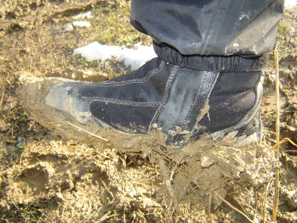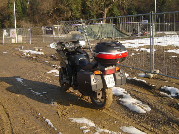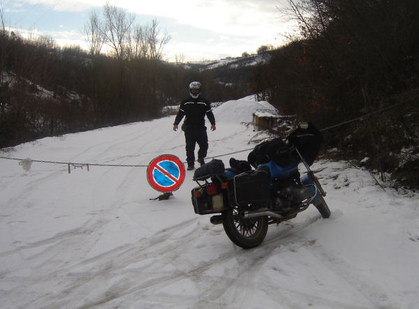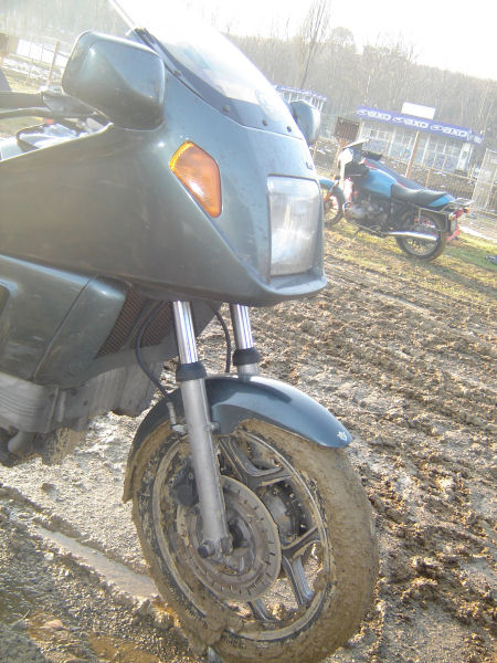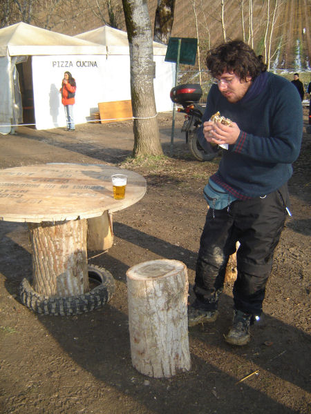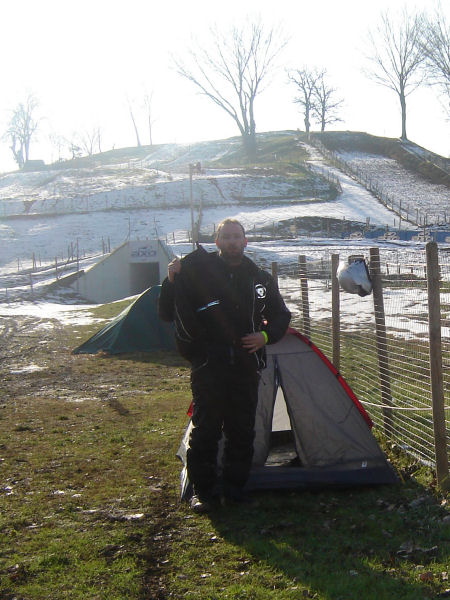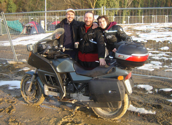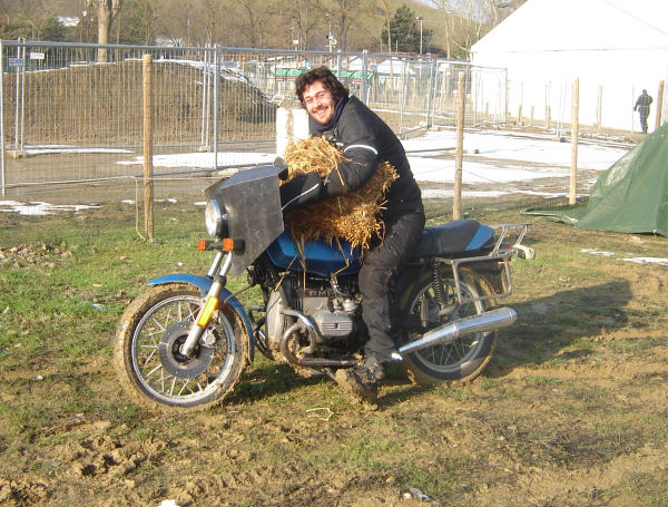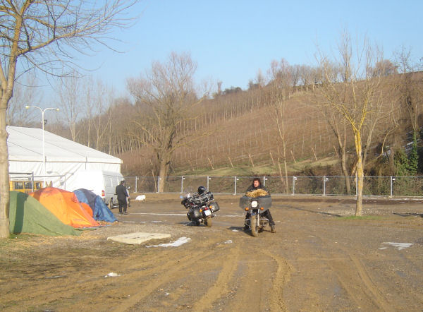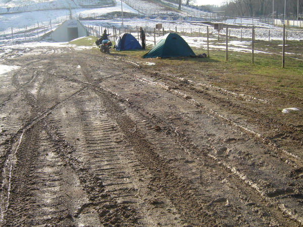 La notte la temperatura scende sotto zero, ma dormiamo senza problemi con i nostri sacchi a pelo. Domenica mattina mi riesce molto difficoltoso spostare la moto, visto che il fango, in cui il cavalletto era sprofondato per parecchi centimetri, si è completamente ghiacciato... Grazie all'aiuto di un vicino di tenda, dopo aver scavato con una pietra attorno alla base del cavalletto e alle gomme, riesco a portare Frau K sulla strada.