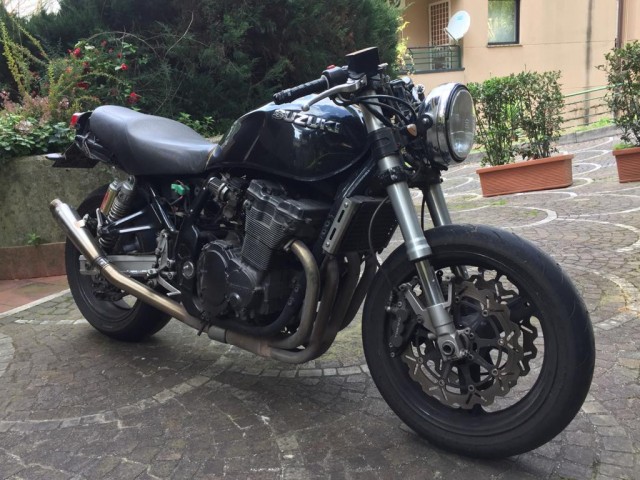 e i freni a steli rovesciati e tolto il codino (voleva tagliarlo per farne una cafe racer) e anche le carene laterali son state rimosse