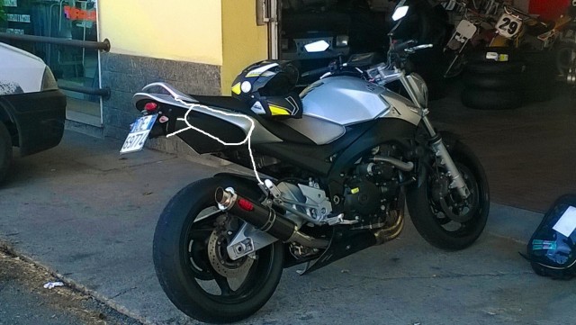 Il perimentro avrebbe come sostegni la vite della pedana passeggero + la vite del maniglione + l'attacco del vecchio telaietto che è ancora li coperto dal tappo di vetroresina e andrebbe a collegarsi all'altro telaitto sotto il codone.Immagine: Link a pagina di Motoclub Tingavert
