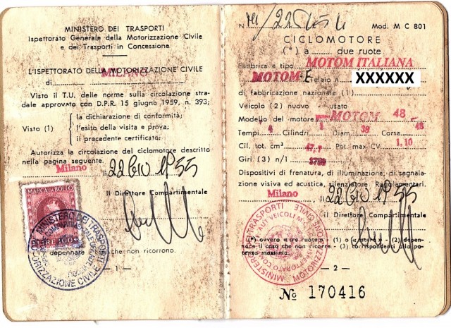 aveva un libretto come bici a motore, che era l'unica categoria in cui erano tutti i 50 cc, fino all'introduzione del nuovo codice della strada del 1959.