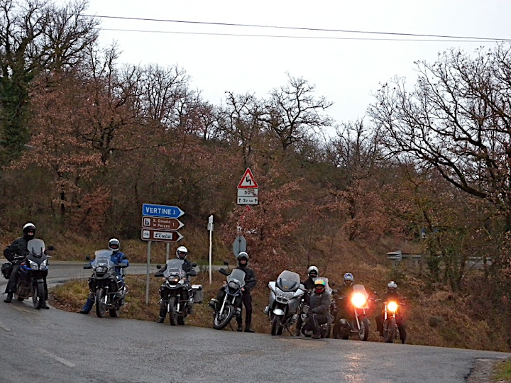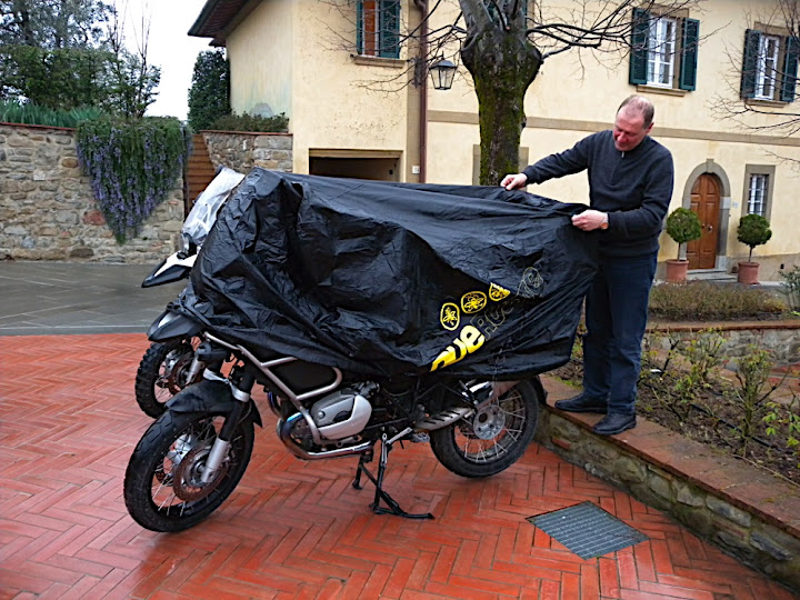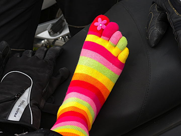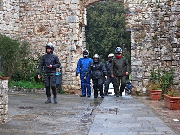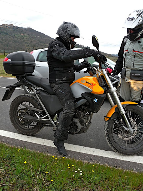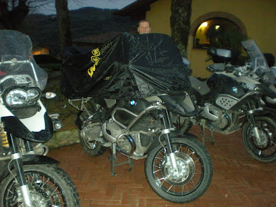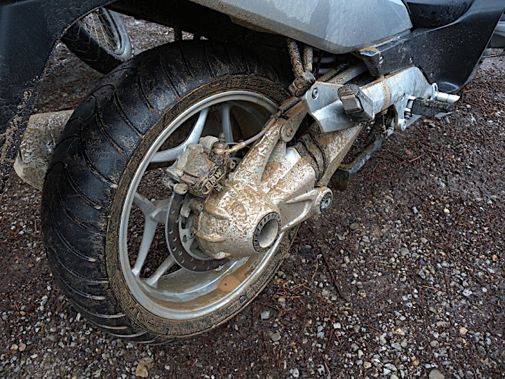 Dato che la temperatura è piuttosto mite rinuncio al sottotuta termico e decido anche di non indossare subito i pantaloni antipioggia. In genere, l'ampia carenatura di Mukkona fa sì che non mi bagni le gambe anche se piove abbastanza. Ma non avevo calcolato la velocità che avremmo tenuto, molto inferiore a quella normale e che avrebbe piovuto ben più che "abbastanza"!