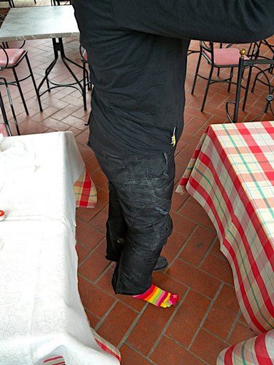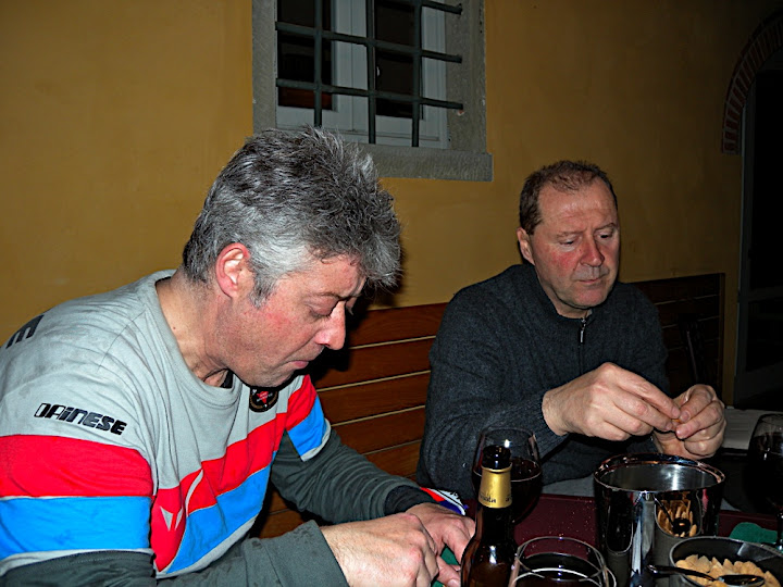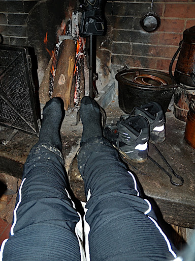 Riprendiamo la strada alla ricerca di un bar e ci imbattiamo in una casa al margine della strada che riporta l'insegna "Hotel, Fiaschetteria, Bar, Ristorante" insomma tutto quello che ci serve. Entro a chiedere se si può prendere un cappuccino e trovo un bel camino acceso con tre gentili signore che ci fanno accomodare. In un battibaleno, ci togliamo gli indumenti fradici e monopolizziamo il camino! Incurante del pericolo (loro) mi tolgo le scarpe e metto i piedi ad asciugare