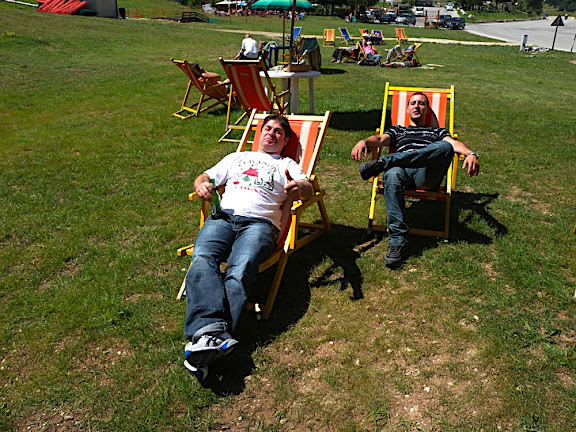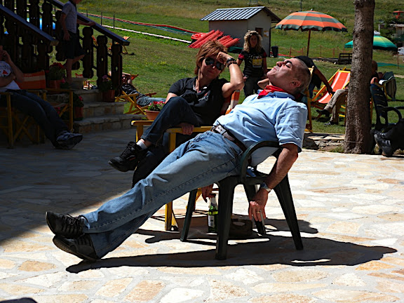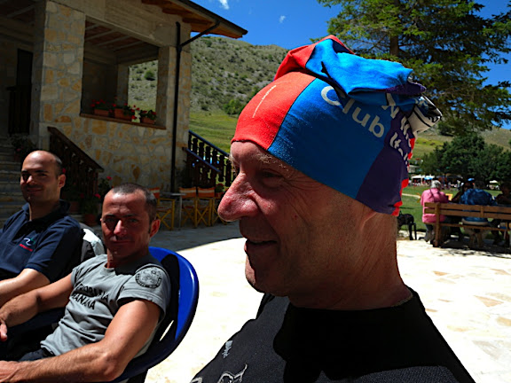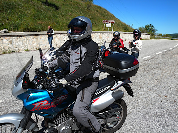 Ripartiamo verso Tagliacozzo ed ecco che succede il fattaccio! PattyR6 va avanti ed io la seguo a debita distanza. Ad una curva a sinistra, non ho capito come, ma certamente perché sono una pippa, freno troppo con il posteriore che si blocca! La moto scivola ed io appresso per una decina di metri. Meno male che andavo relativamente piano ed ero vestito di tutto punto! Rapporto danni: a me, per fortuna, assolutamente nulla; rotto il plexiglass del cupolino, qualche abrasione alla freccia sinistra ed al portatarga, rotta la gomma della manopola sinistra; guanto sinistro con il palmo che non c'è più, gamba sinistra del pantalone un pò rovinata e gomito sinistro della giacca un pò rovinato. Costano un occhio, ma questi indumenti tecnici BMW hanno fatto il loro dovere! Piuttosto come glielo dico a Angelosub che ho graffiato la sua amatissima Dominator?