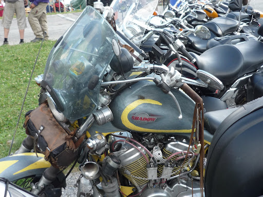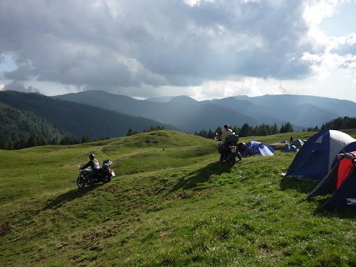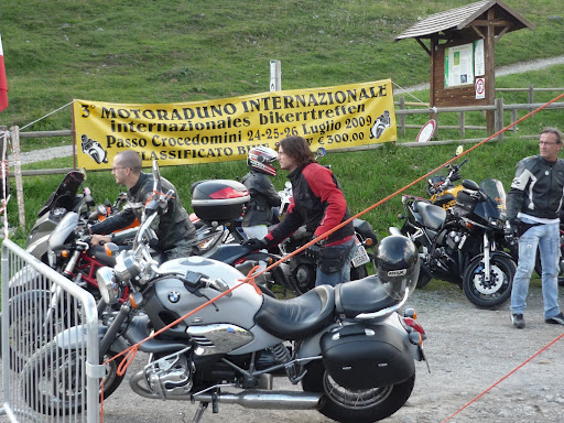, chiamo Fil e mi risponde una vocina assonnata e mezza ciucca poco dopo arrivano un Fil in stato semi-comatoso dovuto all'intera fiaschetta di grappa consumata la sera prima, e lilit. facciamo colazione(un bicchierino da caffè con dentro un centimetro di caffè) e una briosche... ritroviamo stefano e facciamo due chiacchere (mentre io cerco di non ustionarmi con il caffè).. finita la colazione, torniamo di sotto per disfare tutto e ripartire... noto che la maggioranza delle moto che sono rimaste nel prato sono custom, i cui proprietari fanno non poca fatica per riportarle sulla strada dall'erba bagnata in salita! smontiamo tutto, siamo già pronti quando azz... non trovo gli occhiali da sole!!! mi rendo conto di averli lasciati nella tenda che a questo punto era già fatta su, imbustata e fissata al sellino del passeggero