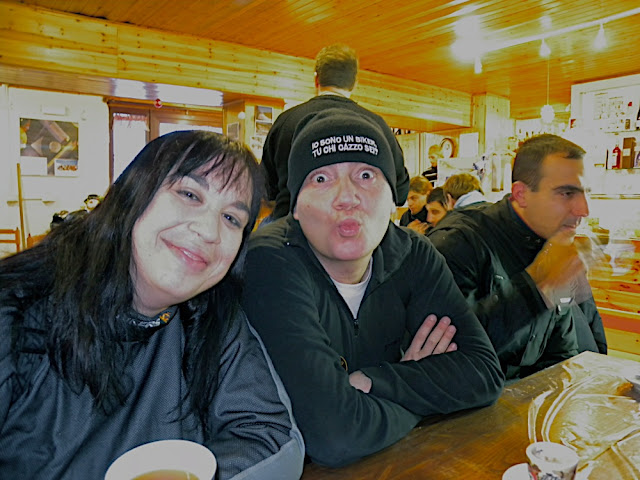 arrivati a destinazione, entriamo nel bar dove ci scaldiamo bevendo un tè o una cioccolata. è davvero bello essere lì, in un rifugio sull'amiata, a gustarsi qualcosa di caldo, essere arrivati lì con le moto nonostante il tempo, e soprattutto avere accanto quelle persone splendide....