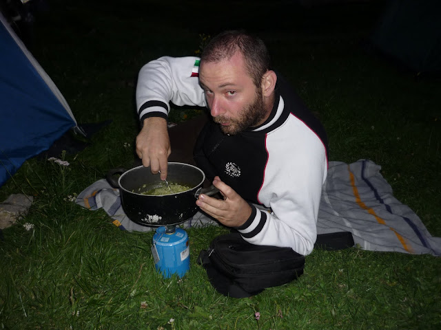 poichè la fila al banco della ristorazione ci appare però infinita decidiamo di attivare la nostra efficientissima cucina da campo, e ci prepariamo un buon risotto con spinaci.