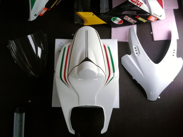 | Note: mai montate eran di scorta, son senza vasca raccogli liquidi verniciatura eseguita da carrozziere quindi sotto lucido, codone aerografato (€150 di vernice di alta qualità)anch'esso sotto lucido di derivazione stradale cioè lo monti con la sella originale togli l'originale e metti questo senza alcuna modifica, cupolino veloce cioè smonti l'originale con tutto il faro e metti questo lasciando i condotti originali più semplice di cosi regalo cupolino double bubble valore 80€ http://img254.imageshack.us/img254/9937/foto0238m.jpg | |