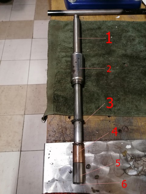 a questo punto si svita il dado numero 6 poi si sfila la boccola numero 5 e infine si sfila la boccola numero 4 poi il paraolio numero 3 e infine la parte cromata numero due.