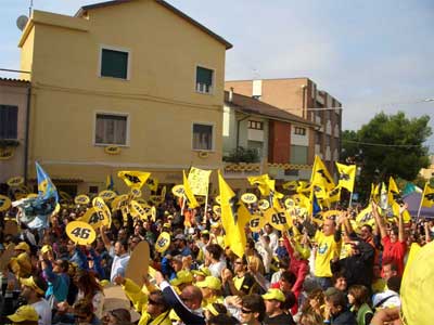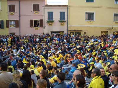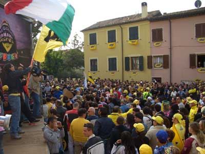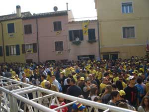 In effetti il paese scoppiava di tifosi, famiglie e curiosi, con una splendida giornata di sole ad aumentare l'euforia. I commercianti che hanno il loro bel da fare, qualcuno che perde la pazienza, ma più si avvicina l'ora del via e più l'euforia generale aumenta.