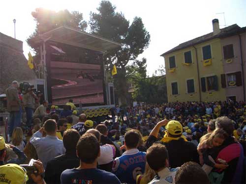 Ogni volta che la telecamera inquadra il Dottore, ancora nei box a prepararsi, il boato è assordante, il delirio della piazza totale. Viene proprio da chiedersi che cosa succederà alla fine di questa corsa, quando tutti potranno finalmente sfogare la gioia e la voglia di gridare che controllano a malapena.