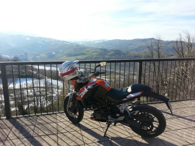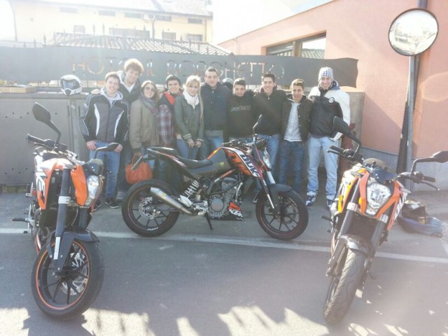 . Quando mi imbatto in un sito di mamma KTM dove cerca 5 aspiranti Ambassador per la all'epoca appena presentata KTM 125 Duke. "Bhè ci provo" ho pensato, ho tempo fino a febbraio quindi ho tempo per lavorarci, approfitto delle vacanze invernali per creare il miglior video possibile per mostrare le mie abilità di guida, lo monto, compilo il questionario e invio tutto. I giorni trascorrono senza nemmeno pensarci troppo quando un venerdì sera dei primi di marzo tornando da allenamento mio papà mi dice: "Ha chiamato la KTM ti hanno scelto per quella cosa la". Penso che non mi dimenticherò mai quei due minuti... Peccato che mio papà non ci ha capito niente e ho dovuto richiamare il lunedì pomeriggio. Chiamo e mi danno tutte le indicazioni devo recarmi a Castelletto di Branduzzo il 15 marzo per fare la selezione finale dove io e altri 9 ragazzi proveremo in anteprima la nuova moto e faremo diverse sfide per conoscere le nostre capacità e conoscenze. La giornata scorre alla grande e l'unico mio rimpianto è stata la sfollata tre prima e seconda nella prova dell'accelerazione e frenata da 50km/h a 0. Però torno a casa ottimista. A metà maggio la decisione è stata presa e dopo aver rotto le scatole a quello che faceva da tramite tra noi e i piani alti di KTM mi faccio dire i risultati e mi comunicano che avrei avuto la moto in test per tre mesi e che avrei avuto la possibilità fini questi tre mesi di portarmela a casa. E' sabato 28 maggio 2011 e finalmente la posso portare a casa. 3 mesi, 8 sfide e parecchi voti dopo arriva la notizia sul sito KTM e poco dopo vengo contattato dicendomi di recarmi all'eicma come loro ospite nel loro stand per la premiazione: Link a pagina di Moto.it Poche settimane dopo mi arriva dal concessionario. Siamo alla fine di dicembre non ha senso immatricolarla ora, aspetto gennaio, febbraio, marzo... E finalmente ad Aprile immatricolazione e assicurazione!!! Ma beffa delle beffe, appena parte l'assicurazione ecco che inizia la pioggia. Per finire il rodaggio ci metto 3 settimane nonostante la pioggia e il mal tempo. La fine di aprile alla prima occasione o preso la strada della vernasca e sono andato a limare un po' le pedane
