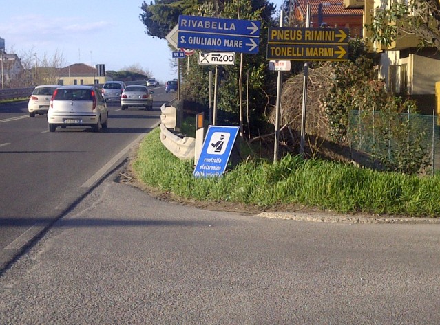 Il tratto in cui gli agenti hanno provveduto a fare controlli, successivo all'intersezione della SS16 con via Stiria, è sprovvisto di segnaletica fissa che avvisi i conducenti della possibilità di controlli con apparecchiature elettroniche per cui gli agenti della Polstrada hanno l'obbligo di porre segnaletica mobile nel caso in cui decidano di fare controlli con autovelox e simili su tale tratto. Tale segnaletica deve essere posta dopo l'intersezione, ma come potete vedere dalle foto hanno messo cartello sull'intersezione stessa abbandonato senza alcun supporto tra l'erba ai bordi del guard rail (neppure sulla parte più vicina alla strada principale) per cui era totalmente invisibile al passaggio nell'incrocio di qualsiasi veicolo.