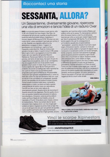 Salve a tutti, anche in questo forum ho letto la rase che ormai si legge assiduamente..........DIVERSAMENTE GIOVANI........ed allora mi son permesso di farvi vedere la mia lettera spedita a MotoSprint,uscita sul numero 4 di gennaio, e così magari mi dite cosa ne pensate dell'idea di organizzare un ritrovo di ....diversamente giovani, in centro Friuli, sulle bellissime colline