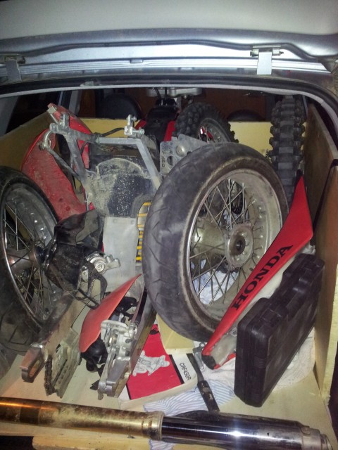 Ciao a tutti, devo comprare un crf 450 motard, ovviamente sfiga vuole che l'ho trovato a 150km da casa mia, non volevo farmi il viaggio due volte ( la prima per fare il trapasso della moto, poi tornare con l'assicurazione e portarla a casa con la schiena a pezzi per il viaggio in moto) allora pensavo di smontare forcelle e ruote e metterla sulla macchina, e portarla a casa con un solo viaggio, anche senza l'assicurazione, ci stà o è un utopia?
